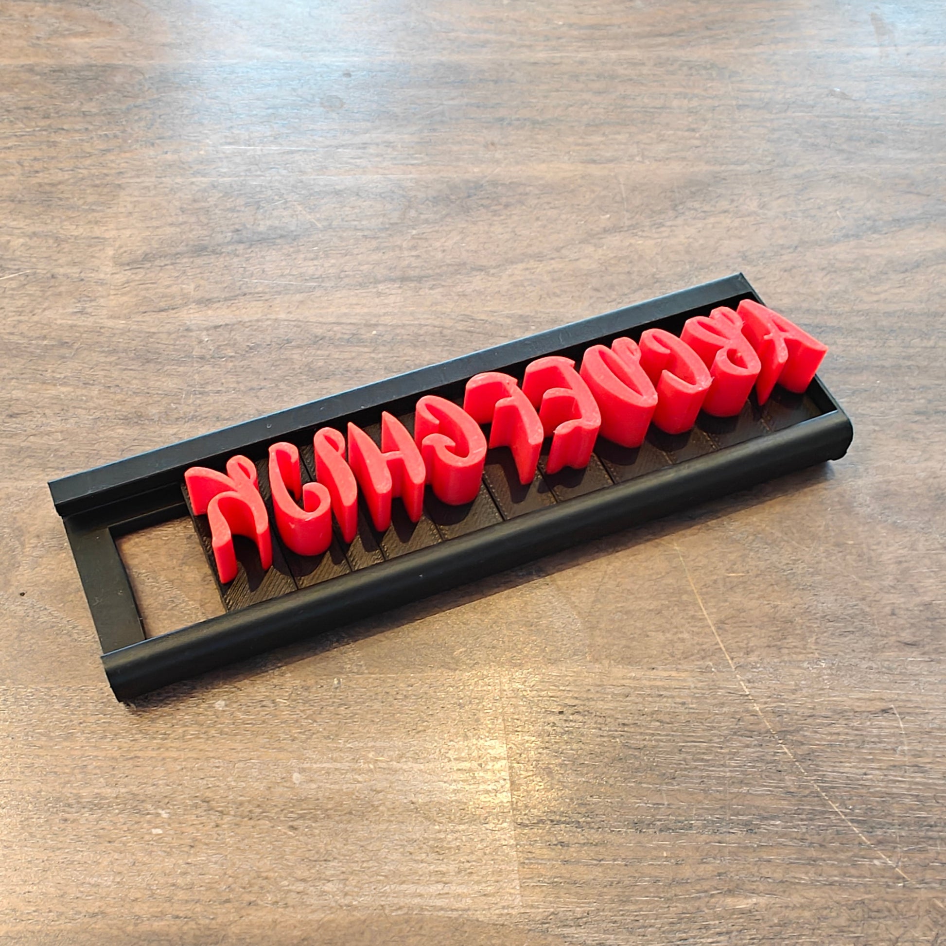 I stedet for at skulle placere hvert bogstav individuelt, har vi udviklet et smart skinnesystem, der holder bogstaverne på plads og sikrer, at de sidder korrekt i forhold til hinanden. Det betyder, at du kan trykke hele ord eller sætninger med perfekt afstand og præcise linjer – hver gang, uden risiko for skæve eller uens aftryk.